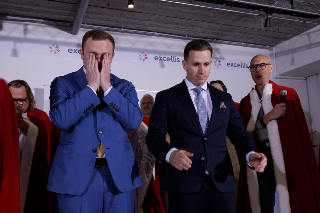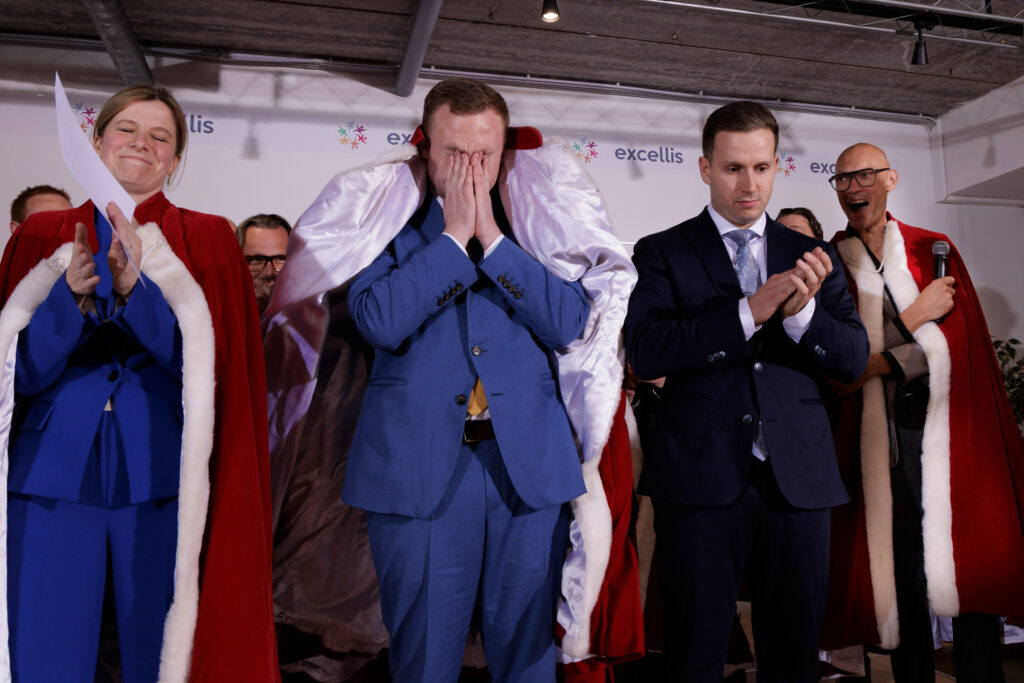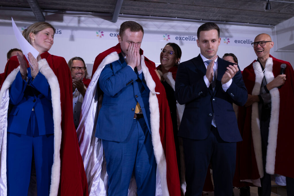 In een zaal vol genodigden kijken vrijwel alle aanwezigen mee via hun smartphones wanneer de ontknoping nadert.